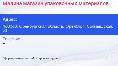 Малина, магазин упаковочных материалов по адресу 460060, Оренбургская область, Оренбург, Салмышская, 51 в дальнейшем Организация, размещена в следующих категориях: