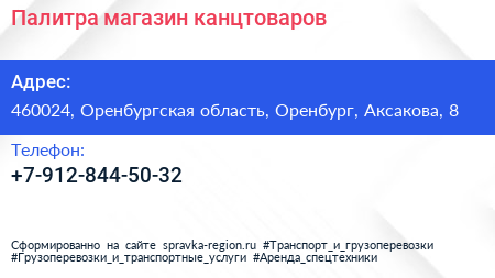 Палитра, магазин канцтоваров по адресу 460024, Оренбургская область, Оренбург, Аксакова, 8 в дальнейшем Организация, размещена в следующих категориях: