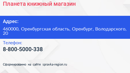 Планета, книжный магазин по адресу 460000, Оренбургская область, Оренбург, Володарского, 20 в дальнейшем Организация, размещена в следующих категориях: