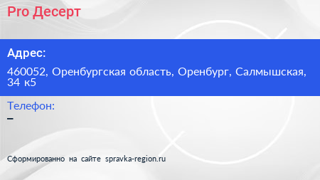 Pro Десерт по адресу 460052, Оренбургская область, Оренбург, Салмышская, 34 к5 в дальнейшем Организация, размещена в следующих категориях: