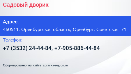 Садовый дворик по адресу 460511, Оренбургская область, Оренбург, Советская, 71 в дальнейшем Организация, размещена в следующих категориях: