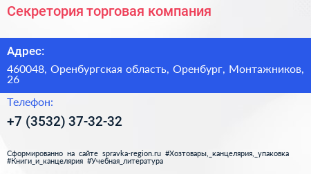 Секретория, торговая компания по адресу 460048, Оренбургская область, Оренбург, Монтажников, 26 в дальнейшем Организация, размещена в следующих категориях: