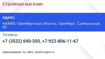 Стройсам, магазин по адресу 460060, Оренбургская область, Оренбург, Салмышская, 60 в дальнейшем Организация, размещена в следующих категориях: