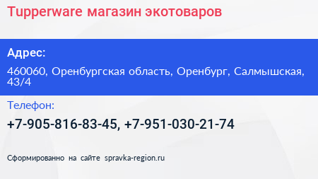 Tupperware, магазин экотоваров по адресу 460060, Оренбургская область, Оренбург, Салмышская, 43/4 в дальнейшем Организация, размещена в следующих категориях: