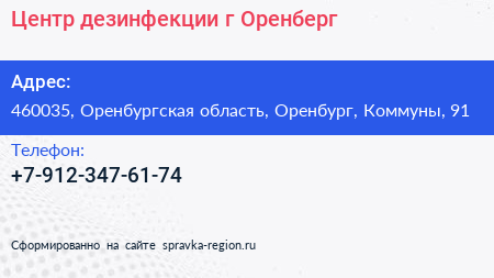 Центр дезинфекции, г. Оренберг по адресу 460035, Оренбургская область, Оренбург, Коммуны, 91 в дальнейшем Организация, размещена в следующих категориях: