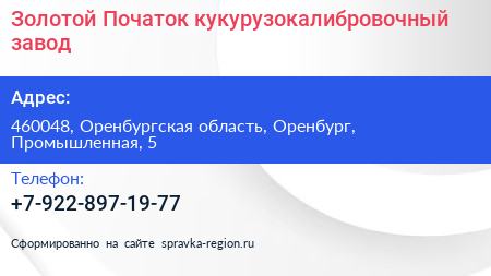 Золотой Початок, кукурузокалибровочный завод по адресу 460048, Оренбургская область, Оренбург, Промышленная, 5 в дальнейшем Организация, размещена в следующих категориях: