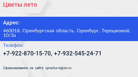 Цветы лето по адресу 460018, Оренбургская область, Оренбург, Терешковой, 10/3а в дальнейшем Организация, размещена в следующих категориях: