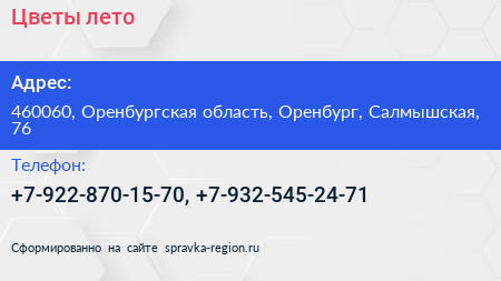 Цветы лето по адресу 460060, Оренбургская область, Оренбург, Салмышская, 76 в дальнейшем Организация, размещена в следующих категориях: