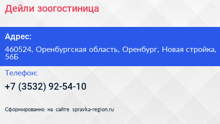 Дейли, зоогостиница по адресу 460524, Оренбургская область, Оренбург, Новая стройка, 56Б в дальнейшем Организация, размещена в следующих категориях: