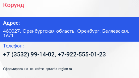 Корунд по адресу 460027, Оренбургская область, Оренбург, Беляевская, 16/1 в дальнейшем Организация, размещена в следующих категориях: