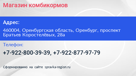 Магазин комбикормов по адресу 460004, Оренбургская область, Оренбург, проспект Братьев Коростелёвых, 28а в дальнейшем Организация, размещена в следующих категориях: