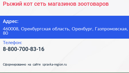 Рыжий кот, сеть магазинов зоотоваров по адресу 460008, Оренбургская область, Оренбург, Газпромовская, 80 в дальнейшем Организация, размещена в следующих категориях: