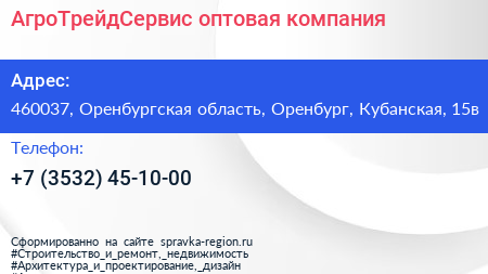 АгроТрейдСервис, оптовая компания по адресу 460037, Оренбургская область, Оренбург, Кубанская, 15в в дальнейшем Организация, размещена в следующих категориях: