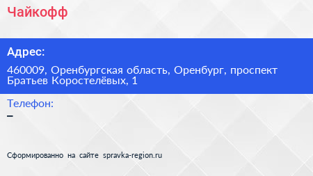 Чайкофф по адресу 460009, Оренбургская область, Оренбург, проспект Братьев Коростелёвых, 1 в дальнейшем Организация, размещена в следующих категориях: