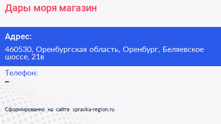 Дары моря, магазин по адресу 460530, Оренбургская область, Оренбург, Беляевское шоссе, 21в в дальнейшем Организация, размещена в следующих категориях: