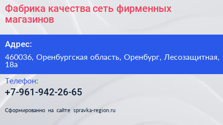 Фабрика качества, сеть фирменных магазинов по адресу 460036, Оренбургская область, Оренбург, Лесозащитная, 18а в дальнейшем Организация, размещена в следующих категориях:
