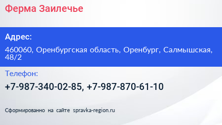 Ферма Заилечье по адресу 460060, Оренбургская область, Оренбург, Салмышская, 48/2 в дальнейшем Организация, размещена в следующих категориях: