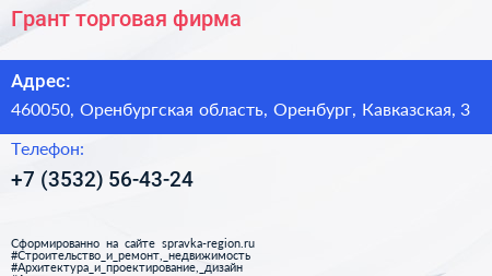 Грант, торговая фирма по адресу 460050, Оренбургская область, Оренбург, Кавказская, 3 в дальнейшем Организация, размещена в следующих категориях:
