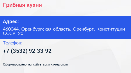 Грибная кухня по адресу 460044, Оренбургская область, Оренбург, Конституции СССР, 20 в дальнейшем Организация, размещена в следующих категориях: