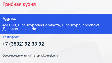 Грибная кухня по адресу 460038, Оренбургская область, Оренбург, проспект Дзержинского, 4а в дальнейшем Организация, размещена в следующих категориях: