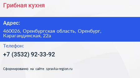 Грибная кухня по адресу 460026, Оренбургская область, Оренбург, Карагандинская, 22а в дальнейшем Организация, размещена в следующих категориях: