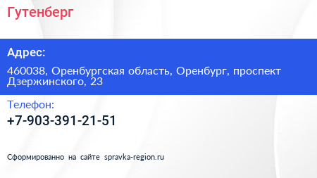 Гутенберг по адресу 460038, Оренбургская область, Оренбург, проспект Дзержинского, 23 в дальнейшем Организация, размещена в следующих категориях: