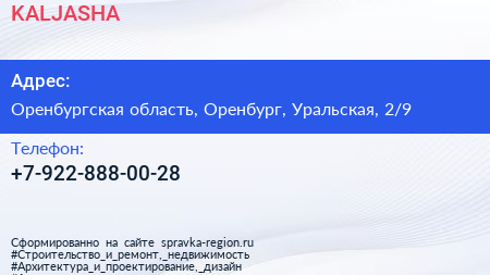 KALJASHA по адресу Оренбургская область, Оренбург, Уральская, 2/9 в дальнейшем Организация, размещена в следующих категориях: