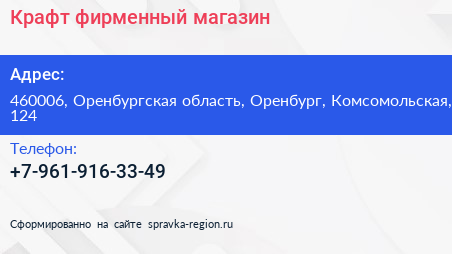 Крафт, фирменный магазин по адресу 460006, Оренбургская область, Оренбург, Комсомольская, 124 в дальнейшем Организация, размещена в следующих категориях: