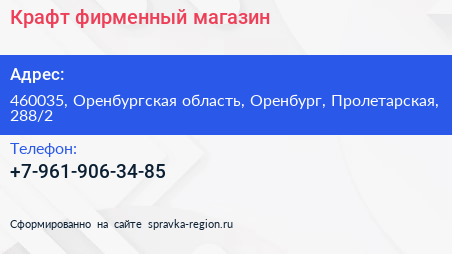Крафт, фирменный магазин по адресу 460035, Оренбургская область, Оренбург, Пролетарская, 288/2 в дальнейшем Организация, размещена в следующих категориях:
