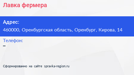 Лавка фермера по адресу 460000, Оренбургская область, Оренбург, Кирова, 14 в дальнейшем Организация, размещена в следующих категориях: