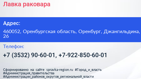 Лавка раковара по адресу 460052, Оренбургская область, Оренбург, Джангильдина, 26 в дальнейшем Организация, размещена в следующих категориях: