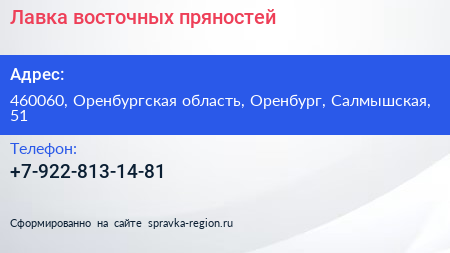 Лавка восточных пряностей по адресу 460060, Оренбургская область, Оренбург, Салмышская, 51 в дальнейшем Организация, размещена в следующих категориях: