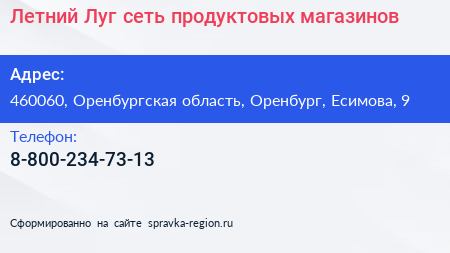 Летний Луг, сеть продуктовых магазинов по адресу 460060, Оренбургская область, Оренбург, Есимова, 9 в дальнейшем Организация, размещена в следующих категориях: