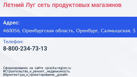 Летний Луг, сеть продуктовых магазинов по адресу 460056, Оренбургская область, Оренбург, Салмышская, 5 в дальнейшем Организация, размещена в следующих категориях: