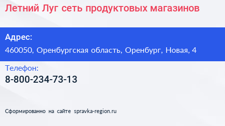 Летний Луг, сеть продуктовых магазинов по адресу 460050, Оренбургская область, Оренбург, Новая, 4 в дальнейшем Организация, размещена в следующих категориях:
