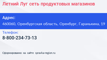 Летний Луг, сеть продуктовых магазинов по адресу 460060, Оренбургская область, Оренбург, Гаранькина, 19 в дальнейшем Организация, размещена в следующих категориях: