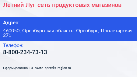 Летний Луг, сеть продуктовых магазинов по адресу 460050, Оренбургская область, Оренбург, Пролетарская, 271 в дальнейшем Организация, размещена в следующих категориях: