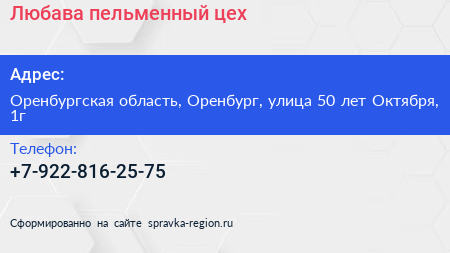 Любава, пельменный цех по адресу Оренбургская область, Оренбург, улица 50 лет Октября, 1г в дальнейшем Организация, размещена в следующих категориях: