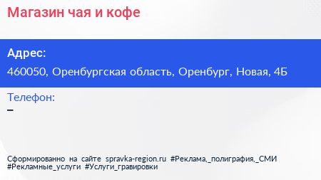 Магазин чая и кофе по адресу 460050, Оренбургская область, Оренбург, Новая, 4Б в дальнейшем Организация, размещена в следующих категориях: