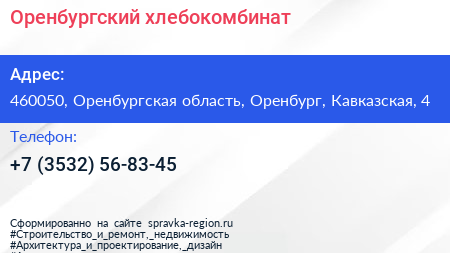 Оренбургский хлебокомбинат по адресу 460050, Оренбургская область, Оренбург, Кавказская, 4 в дальнейшем Организация, размещена в следующих категориях:
