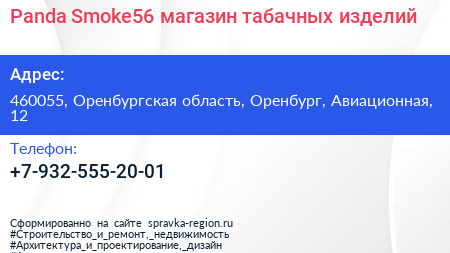 Panda.Smoke56, магазин табачных изделий по адресу 460055, Оренбургская область, Оренбург, Авиационная, 12 в дальнейшем Организация, размещена в следующих категориях: