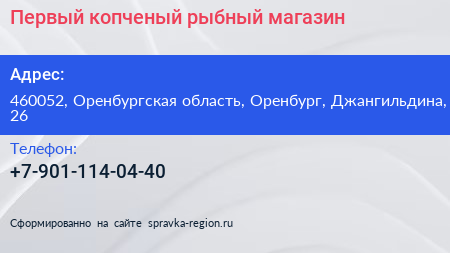 Первый копченый, рыбный магазин по адресу 460052, Оренбургская область, Оренбург, Джангильдина, 26 в дальнейшем Организация, размещена в следующих категориях: