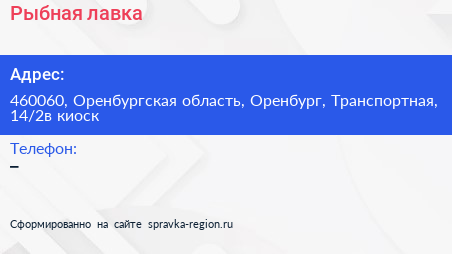 Рыбная лавка по адресу 460060, Оренбургская область, Оренбург, Транспортная, 14/2в киоск в дальнейшем Организация, размещена в следующих категориях: