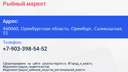 Рыбный маркет по адресу 460060, Оренбургская область, Оренбург, Салмышская, 51 в дальнейшем Организация, размещена в следующих категориях: