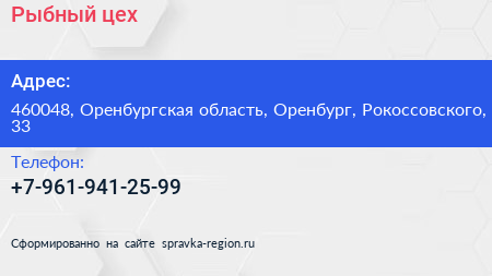 Рыбный цех по адресу 460048, Оренбургская область, Оренбург, Рокоссовского, 33 в дальнейшем Организация, размещена в следующих категориях: