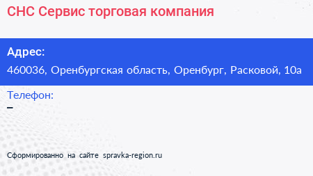 СНС Сервис, торговая компания по адресу 460036, Оренбургская область, Оренбург, Расковой, 10а в дальнейшем Организация, размещена в следующих категориях: