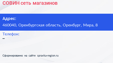 СОВИН, сеть магазинов по адресу 460040, Оренбургская область, Оренбург, Мира, 8 в дальнейшем Организация, размещена в следующих категориях: