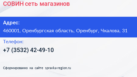 СОВИН, сеть магазинов по адресу 460001, Оренбургская область, Оренбург, Чкалова, 31 в дальнейшем Организация, размещена в следующих категориях: