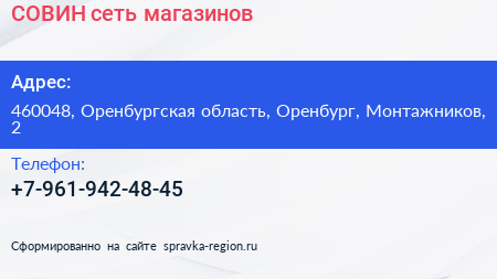 СОВИН, сеть магазинов по адресу 460048, Оренбургская область, Оренбург, Монтажников, 2 в дальнейшем Организация, размещена в следующих категориях: