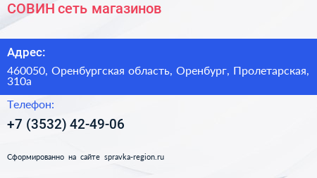 СОВИН, сеть магазинов по адресу 460050, Оренбургская область, Оренбург, Пролетарская, 310а в дальнейшем Организация, размещена в следующих категориях: